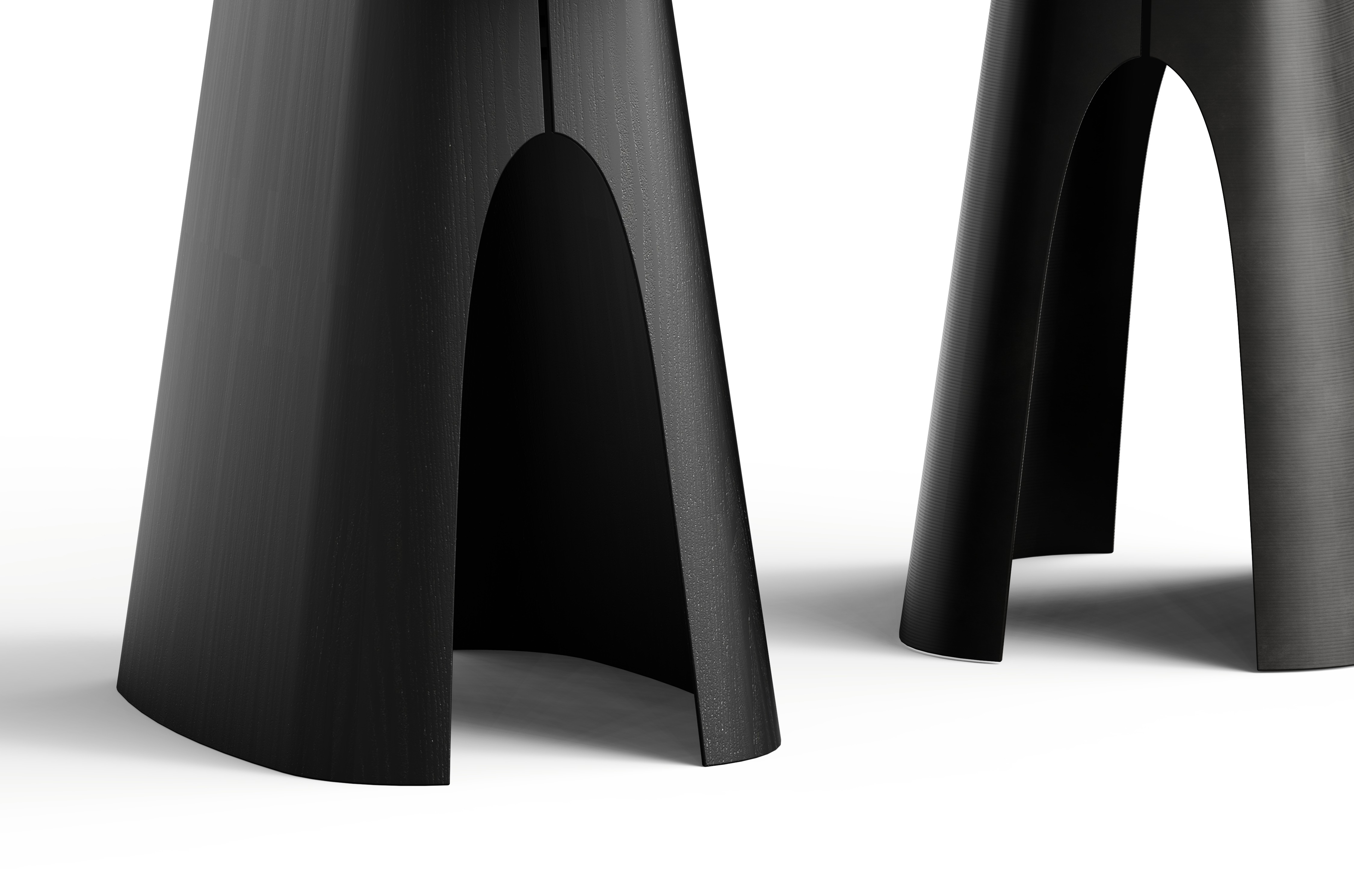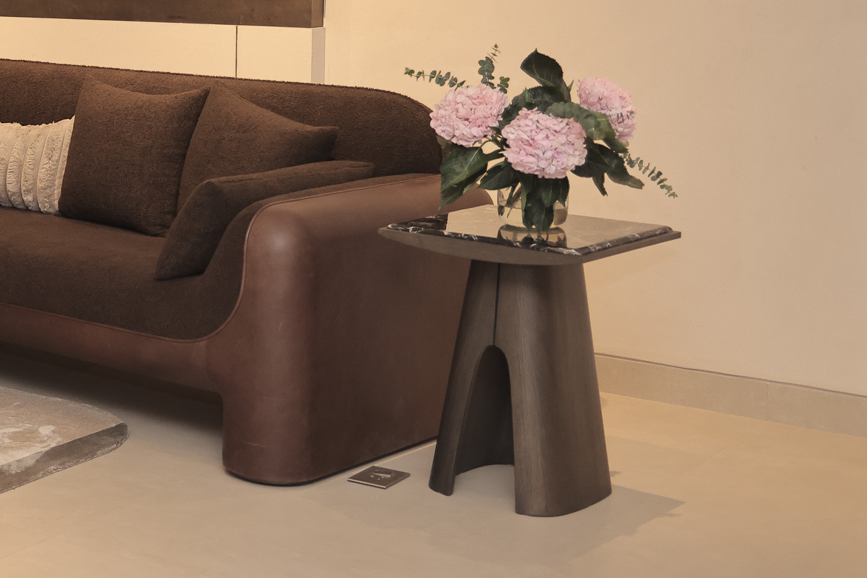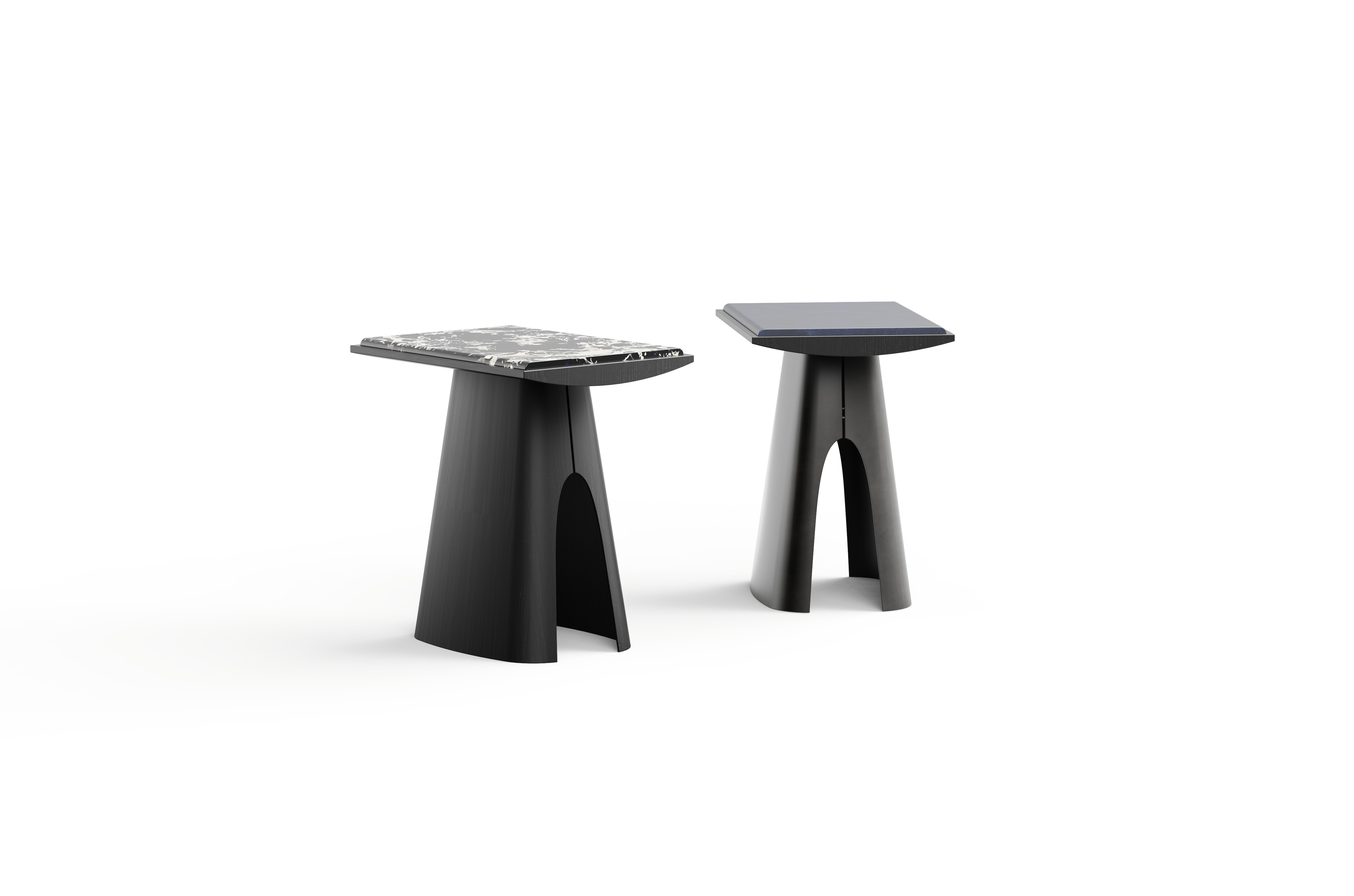 A refined take on the side table, Arcella balances straight lines with graceful curves. A pure marble top rests on a veneer platform with a curved edge, above a tapered base with rounded corners. An arched cut-out and split peak detail echo the platform’s curve, adding harmony, sophistication, and sculptural presence.