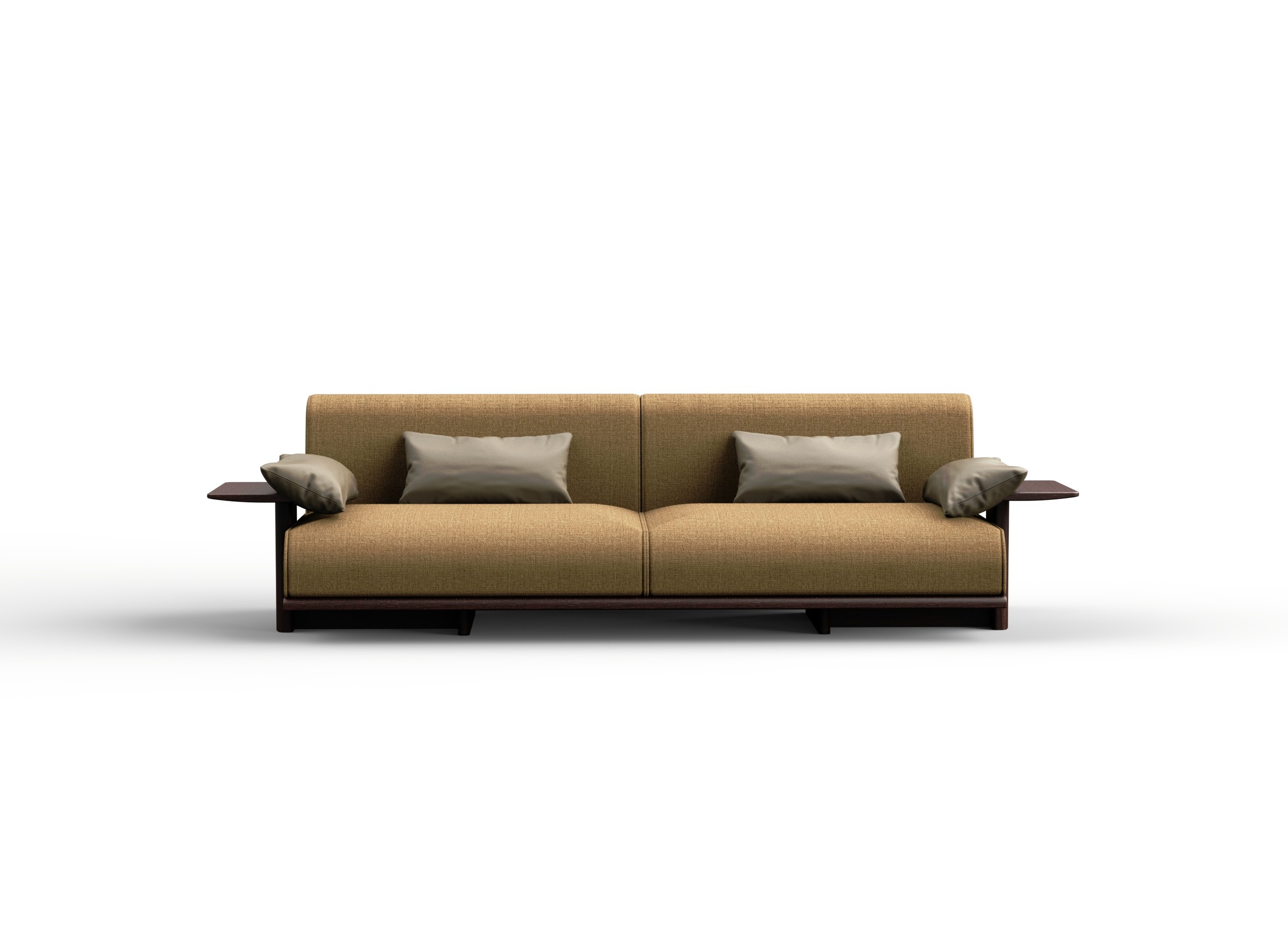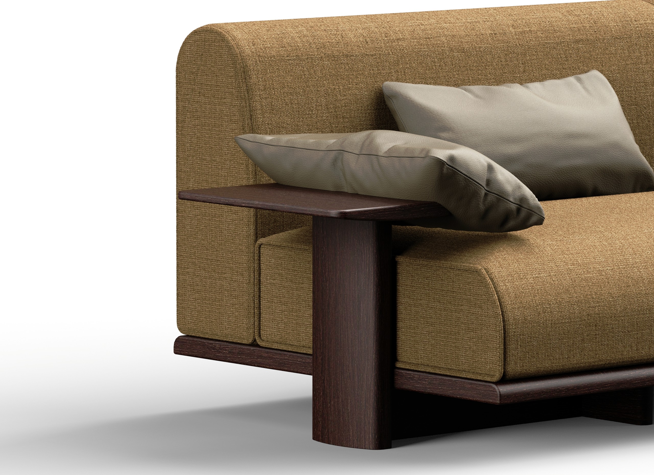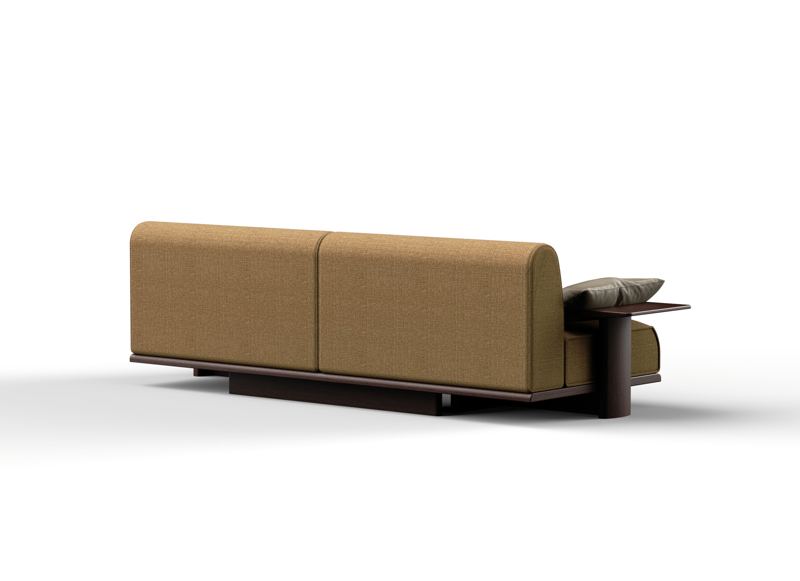 Designed with a balance of simplicity and warmth, this sofa sits at the intersection of Japanese minimalism and Scandinavian functionality. Upholstered in soft fabric, it rests on a solid wooden base with integrated side tables. These side tables are designed to serve a dual function - offering practical surfaces while also acting as supportive structures that, with the addition of cushions, provide a comfortable place to lean. Slightly elevated above the seat, they create the right ergonomic balance, reinterpreting the idea of armrests with elegance and utility.