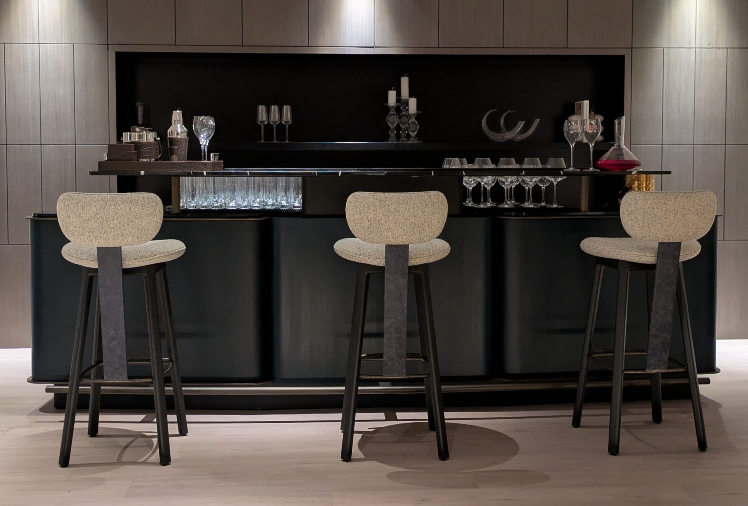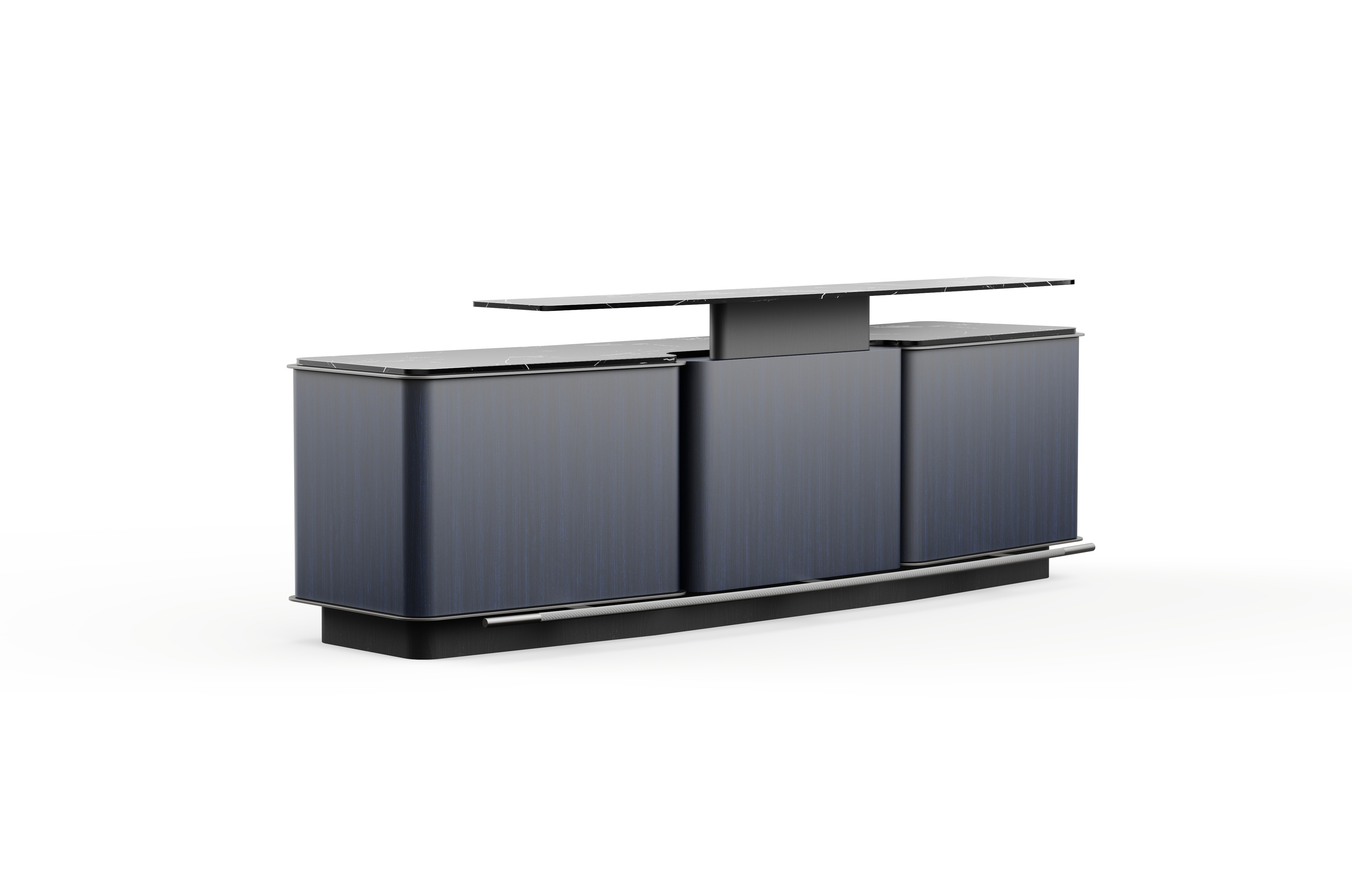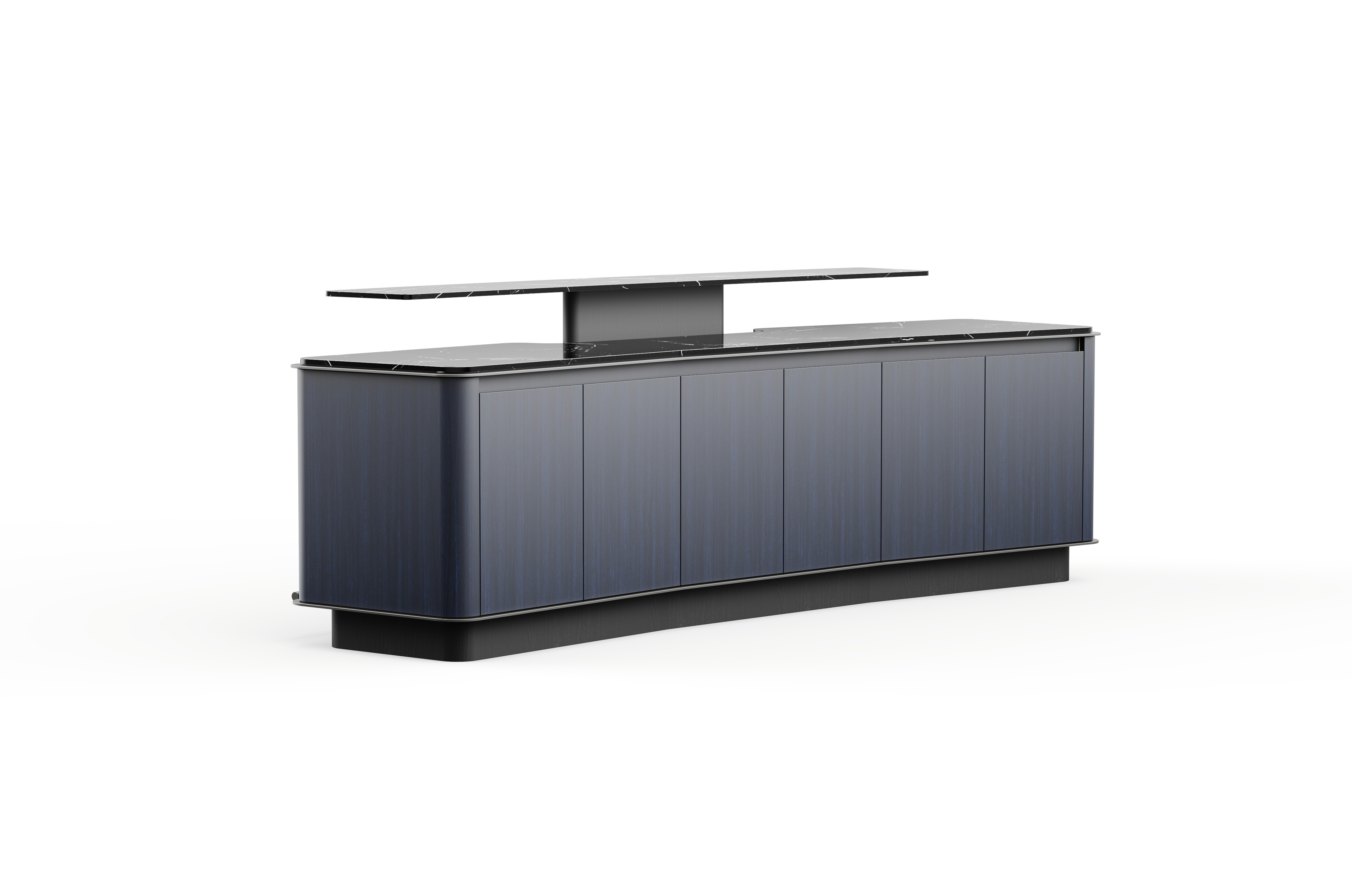A part of Trestle's inaugural lineup of products, this bar counter fuses angular form with softened curves and rich veneer finishes. A central rounded column supports a recessed top, creating dynamic light-play. Knurled and brushed metal details define its silhouette, adding functional flair and luxe accents. Resting on a veneer skirting, it embodies refined craftsmanship and timeless sophistication.