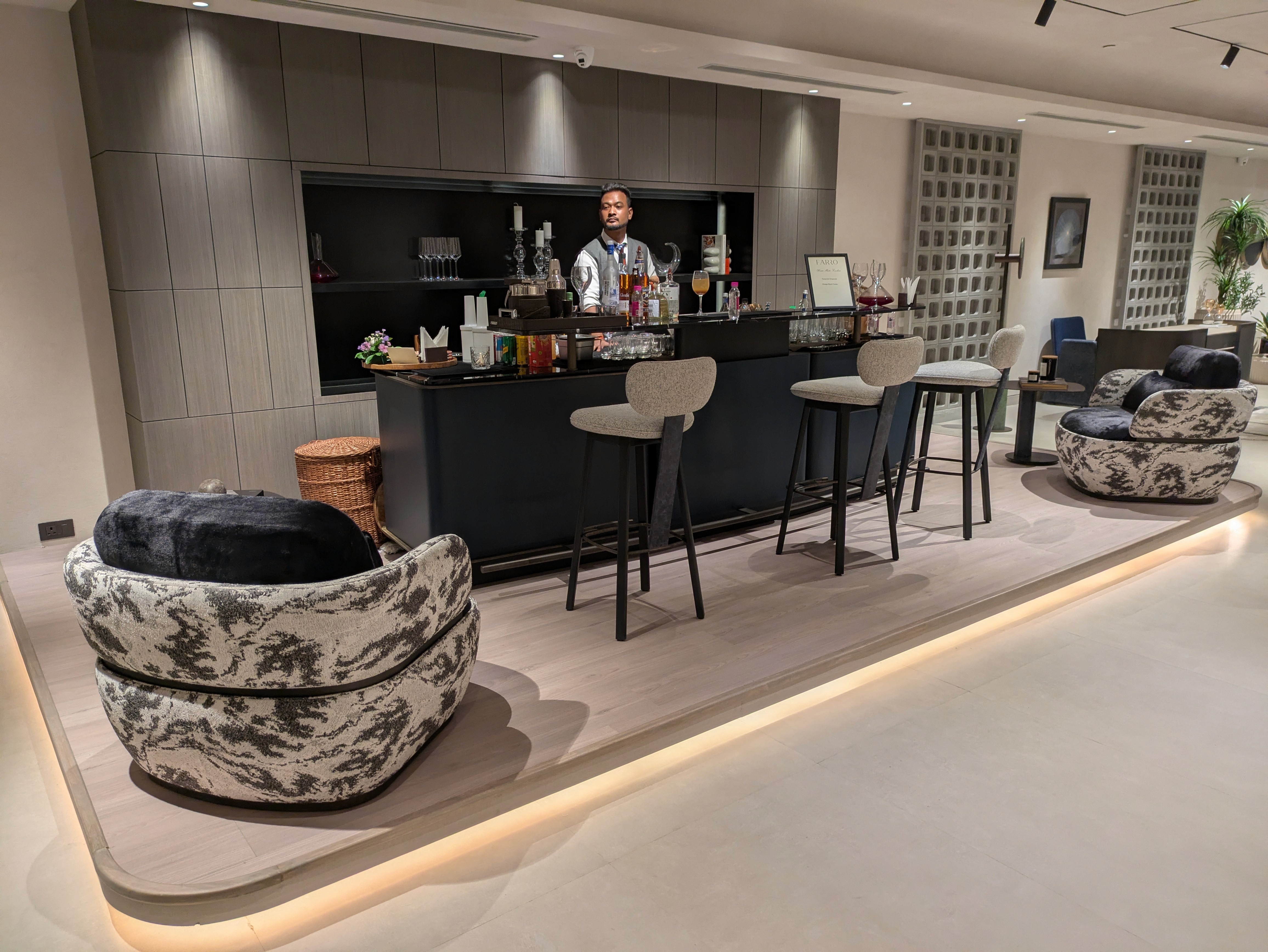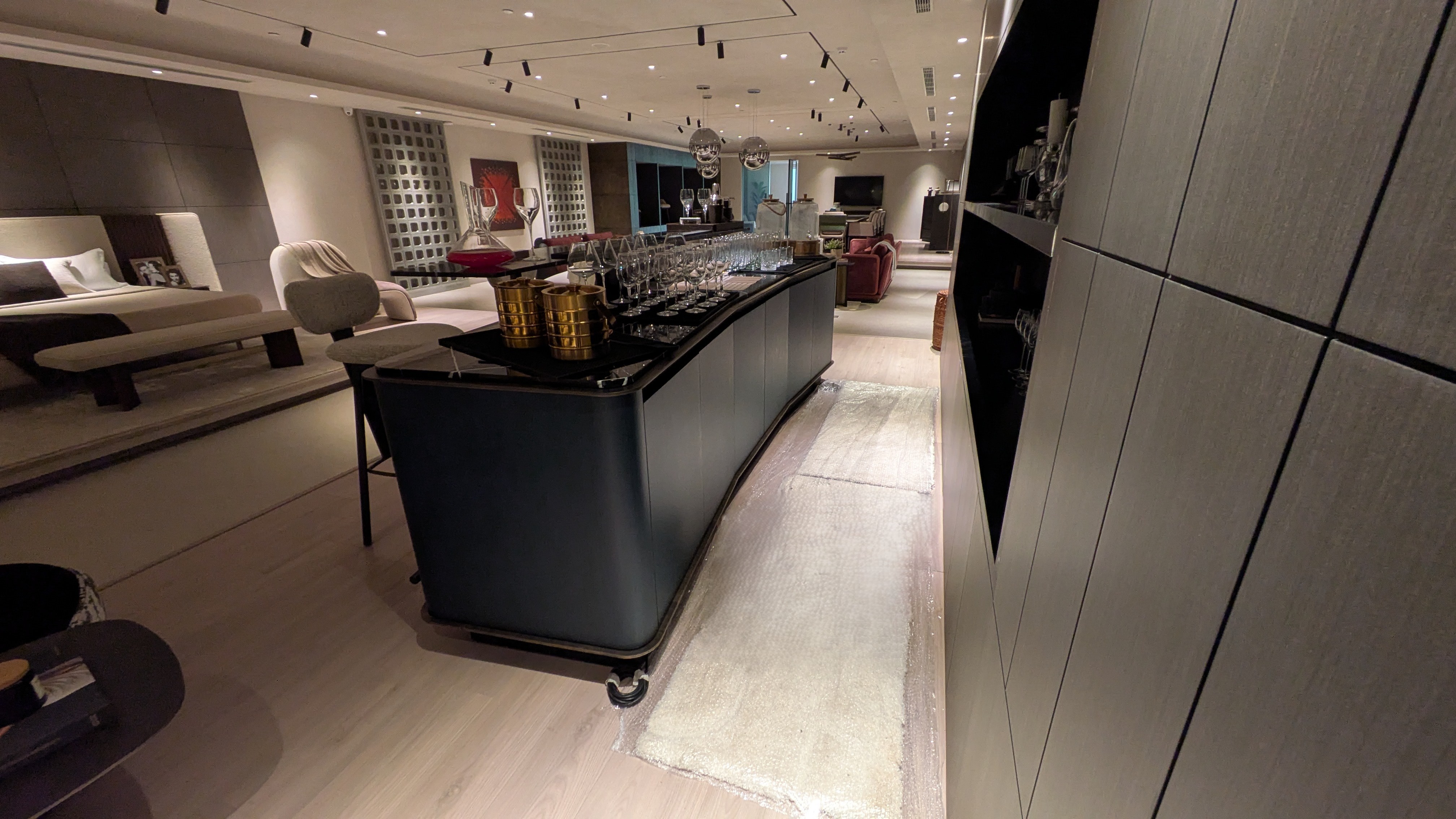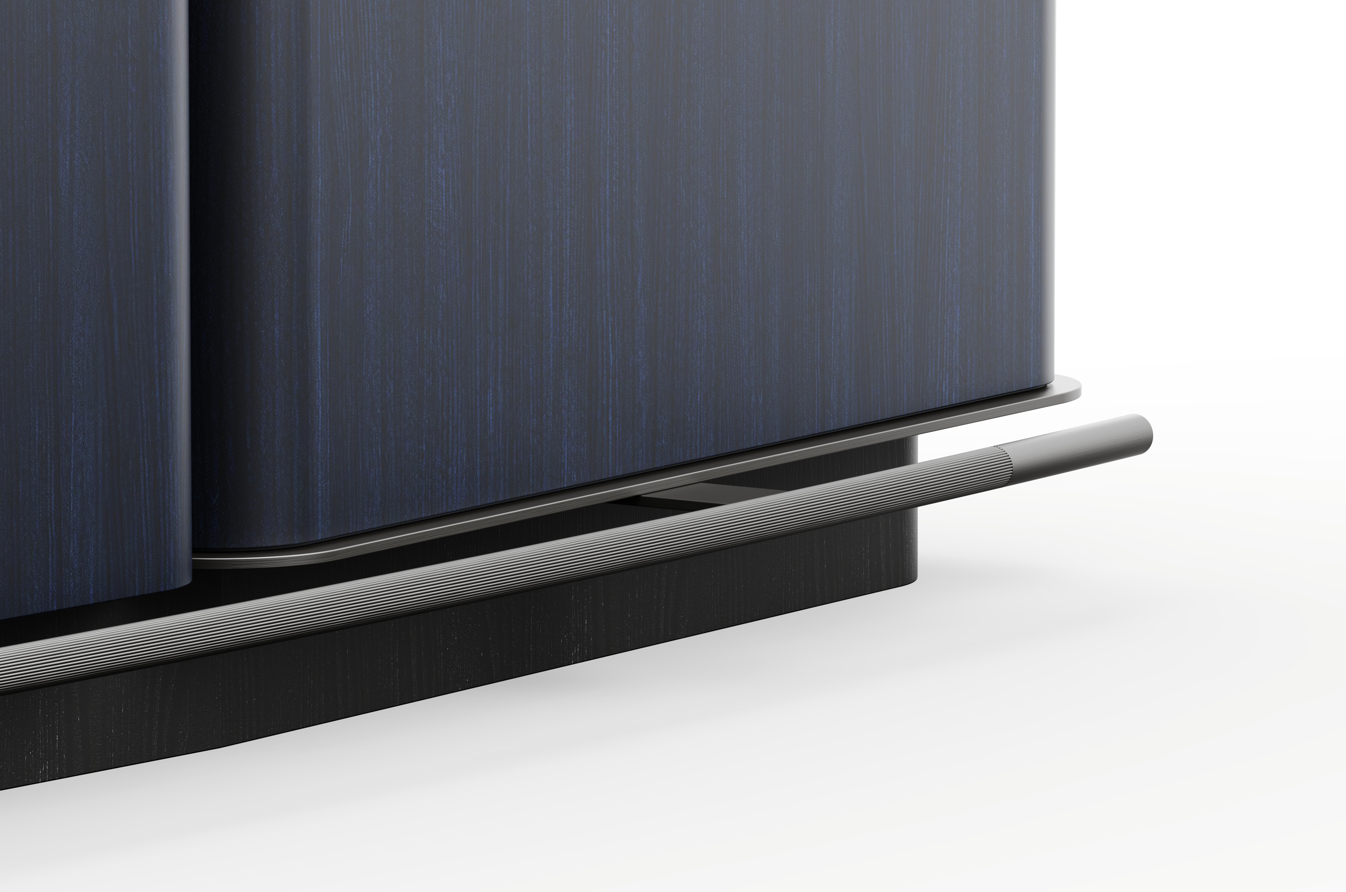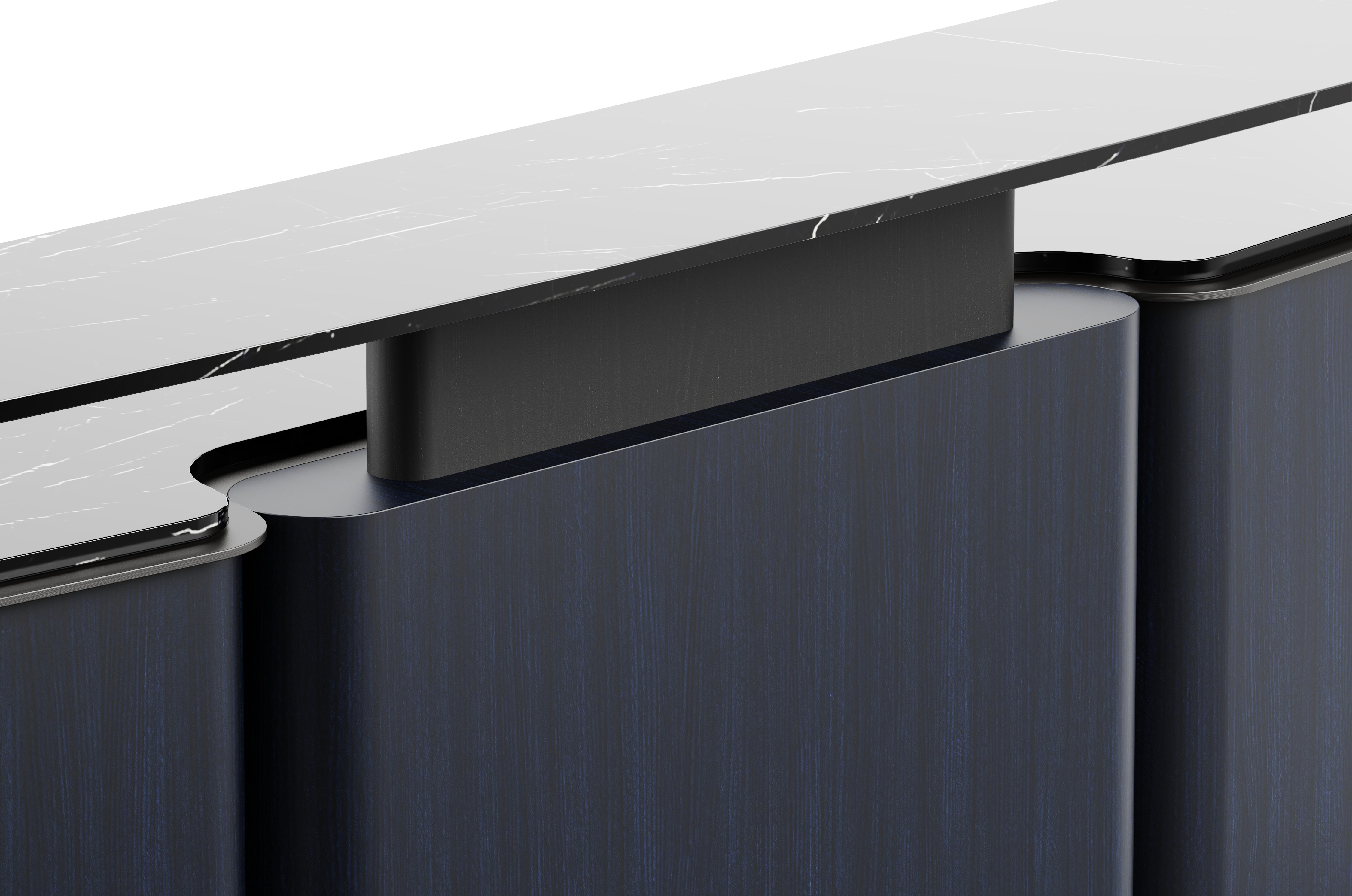 A part of Trestle's inaugural lineup of products, this bar counter fuses angular form with softened curves and rich veneer finishes. A central rounded column supports a recessed top, creating dynamic light-play. Knurled and brushed metal details define its silhouette, adding functional flair and luxe accents. Resting on a veneer skirting, it embodies refined craftsmanship and timeless sophistication.