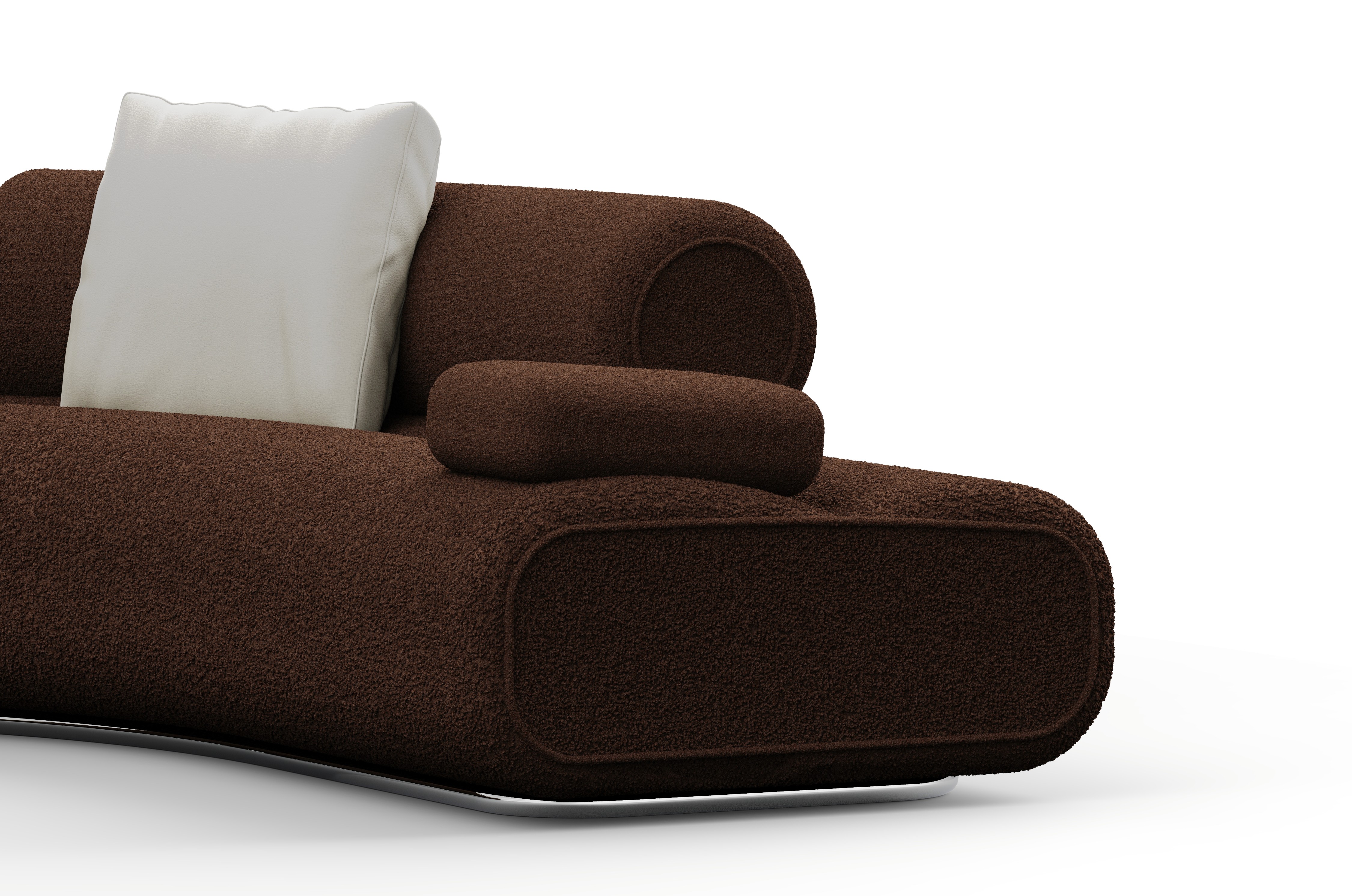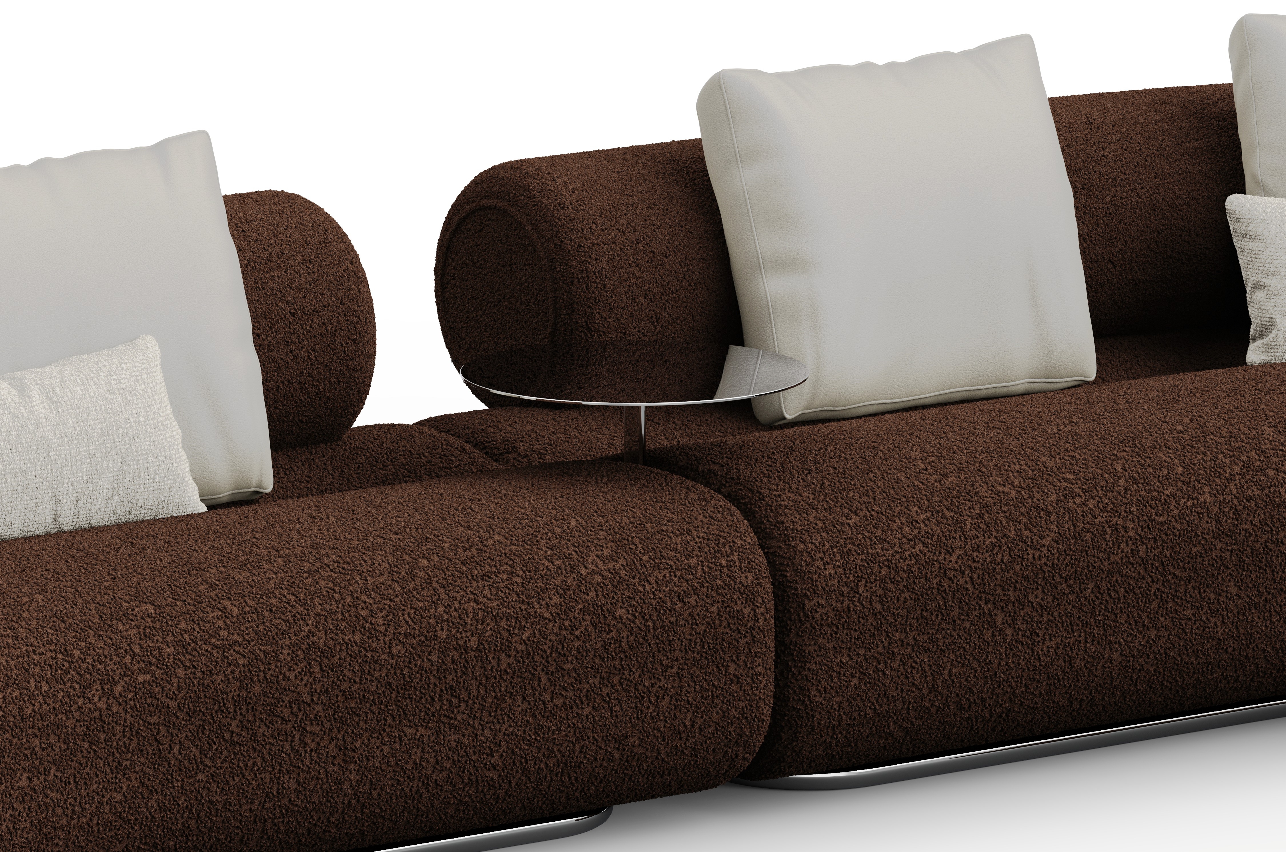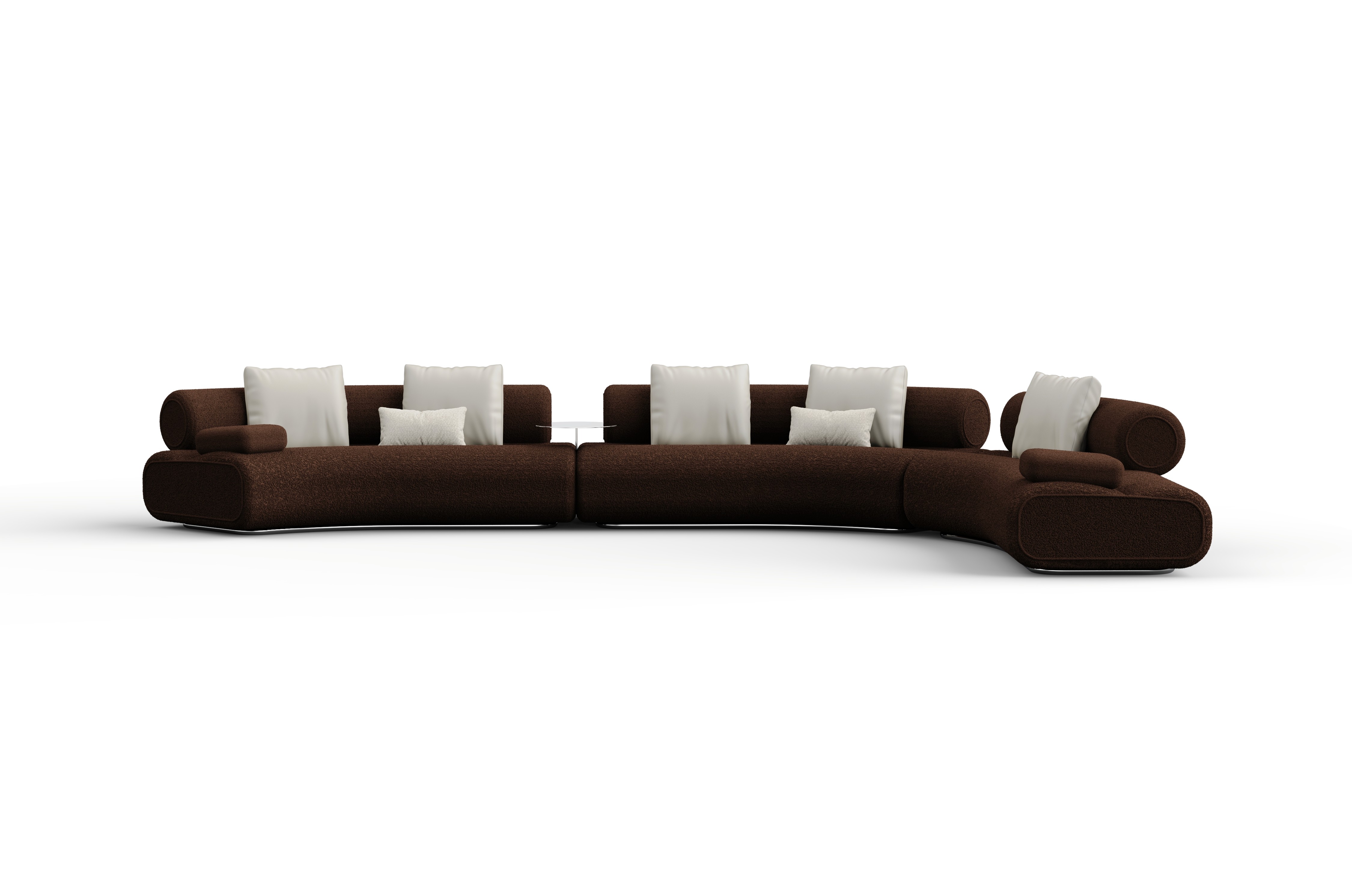 The Eero modular sofa embodies fluid sophistication, with curvilinear modules culminating in a fully arc-shaped corner for a graceful, continuous sweep. An integrated circular side table adds functional elegance, while the seat embodies a sharp valley in its form that yields a line traversing the curvature of the modules, accentuating their contours. Versatile and refined, Eero transforms modularity into sculptural comfort.