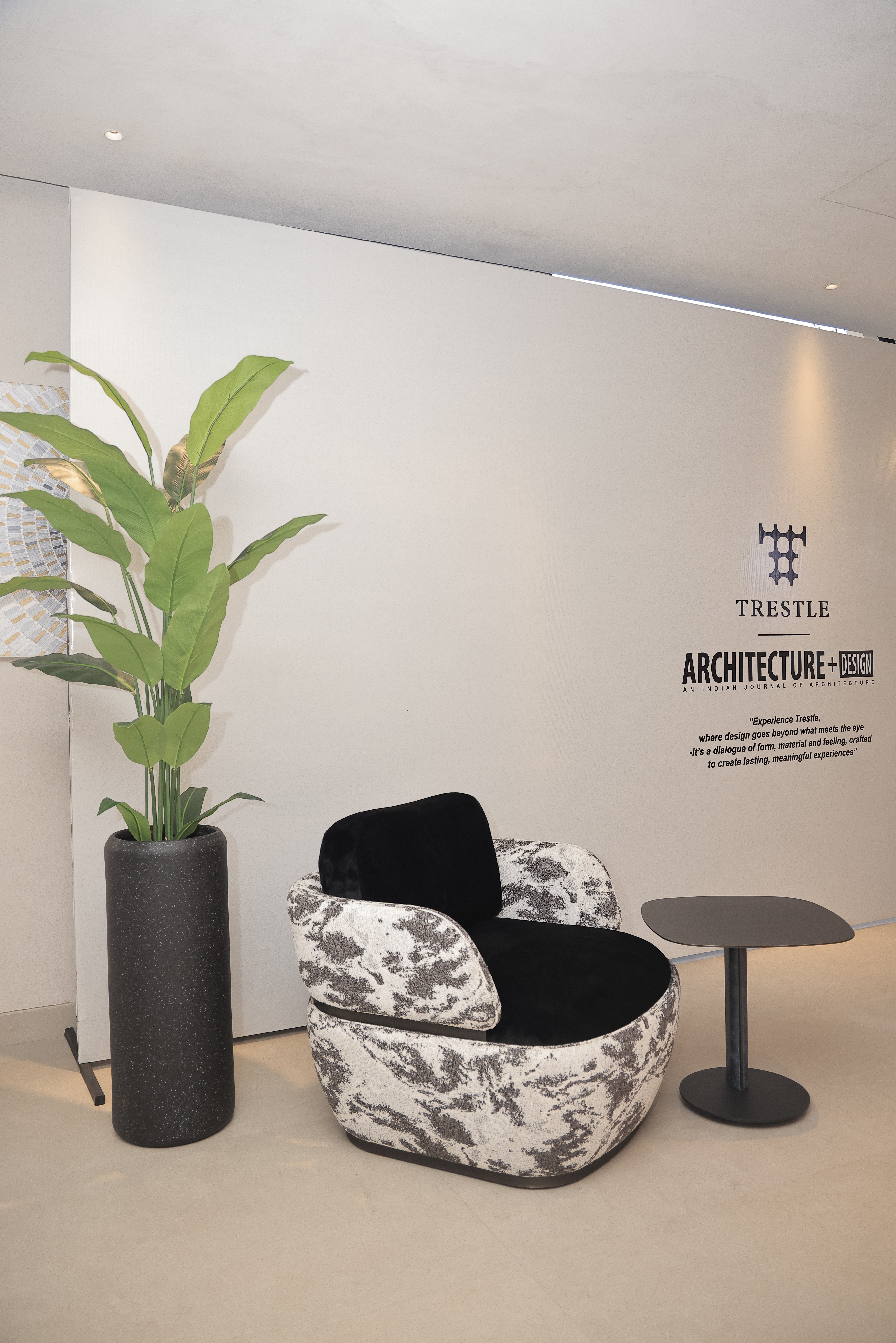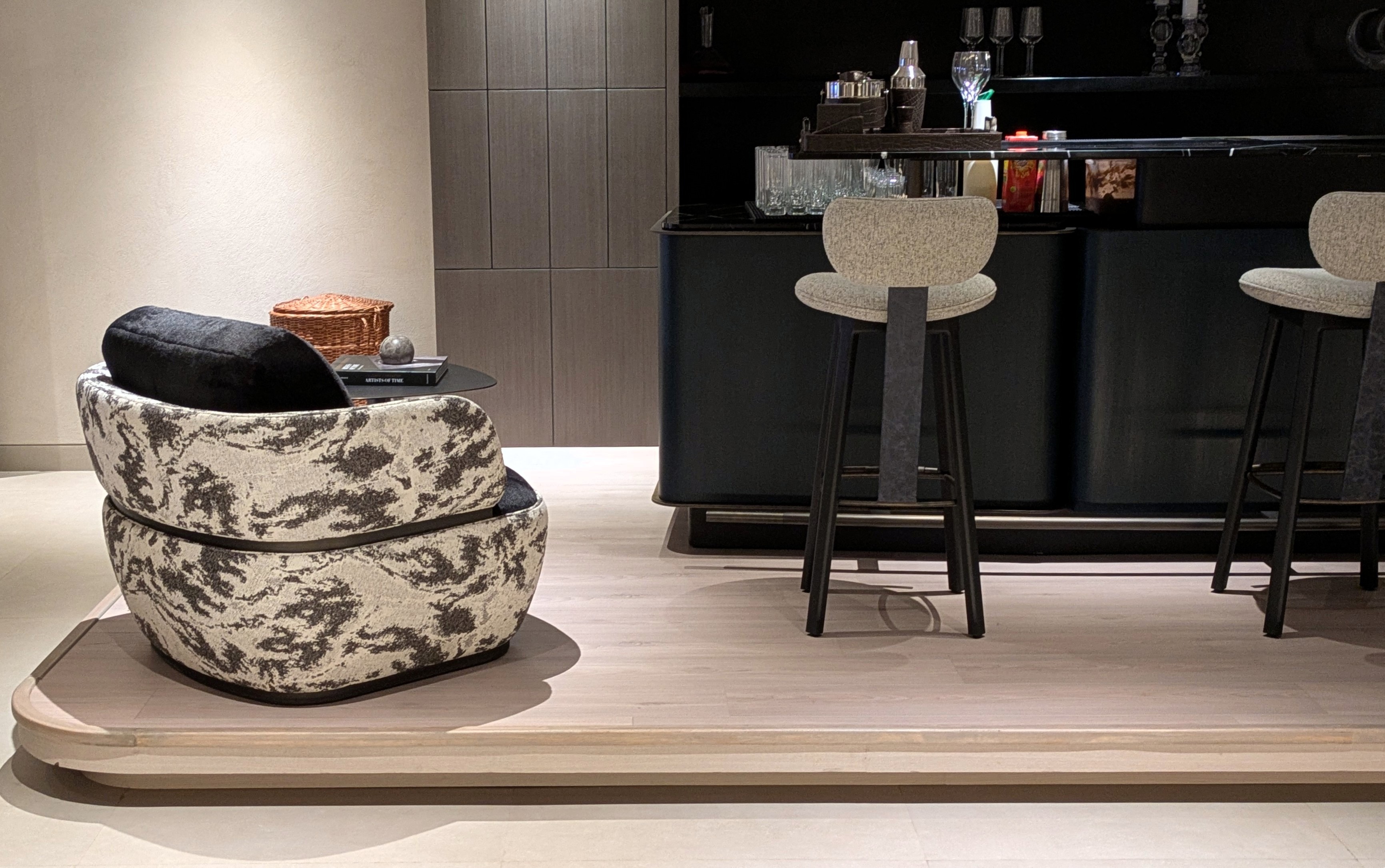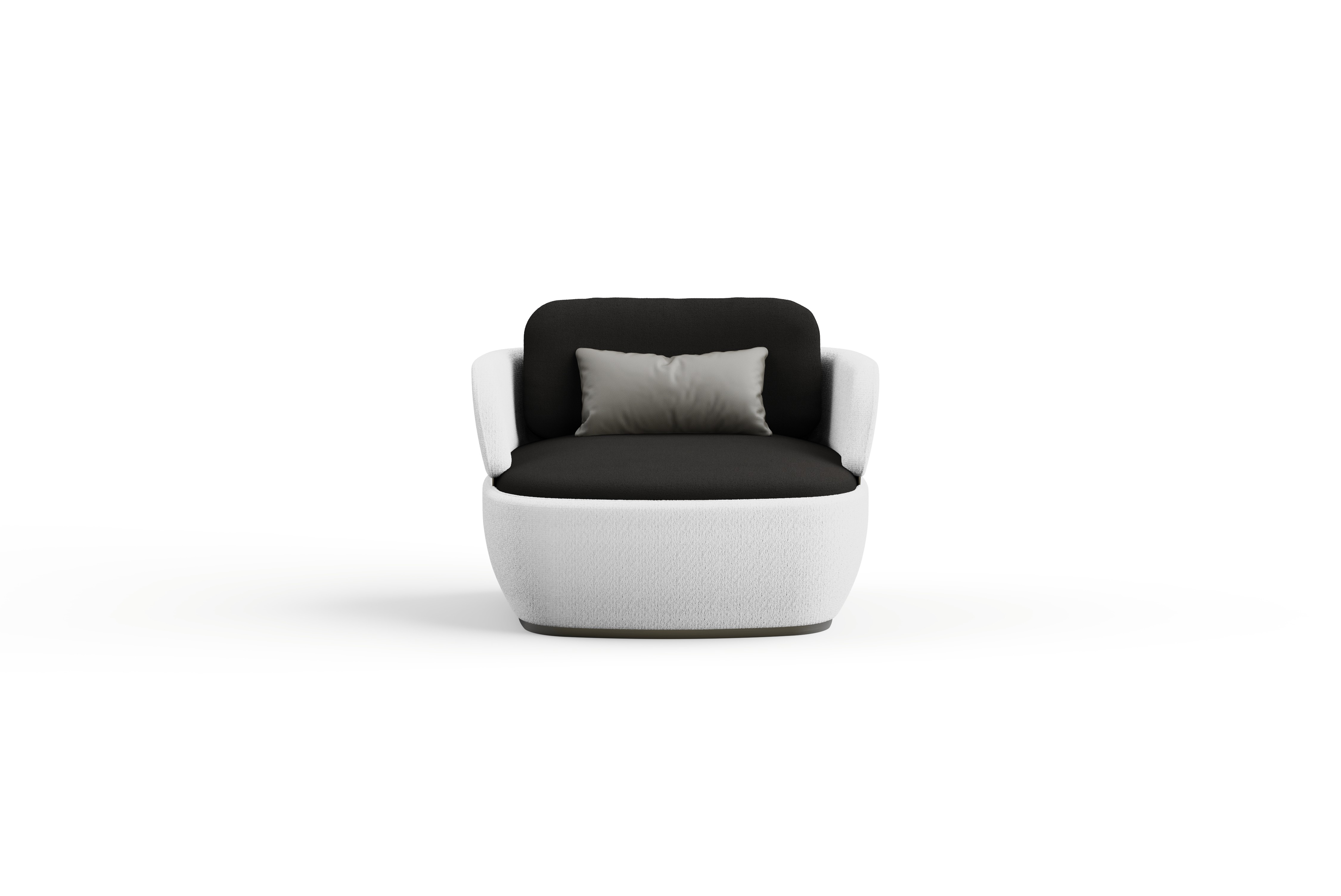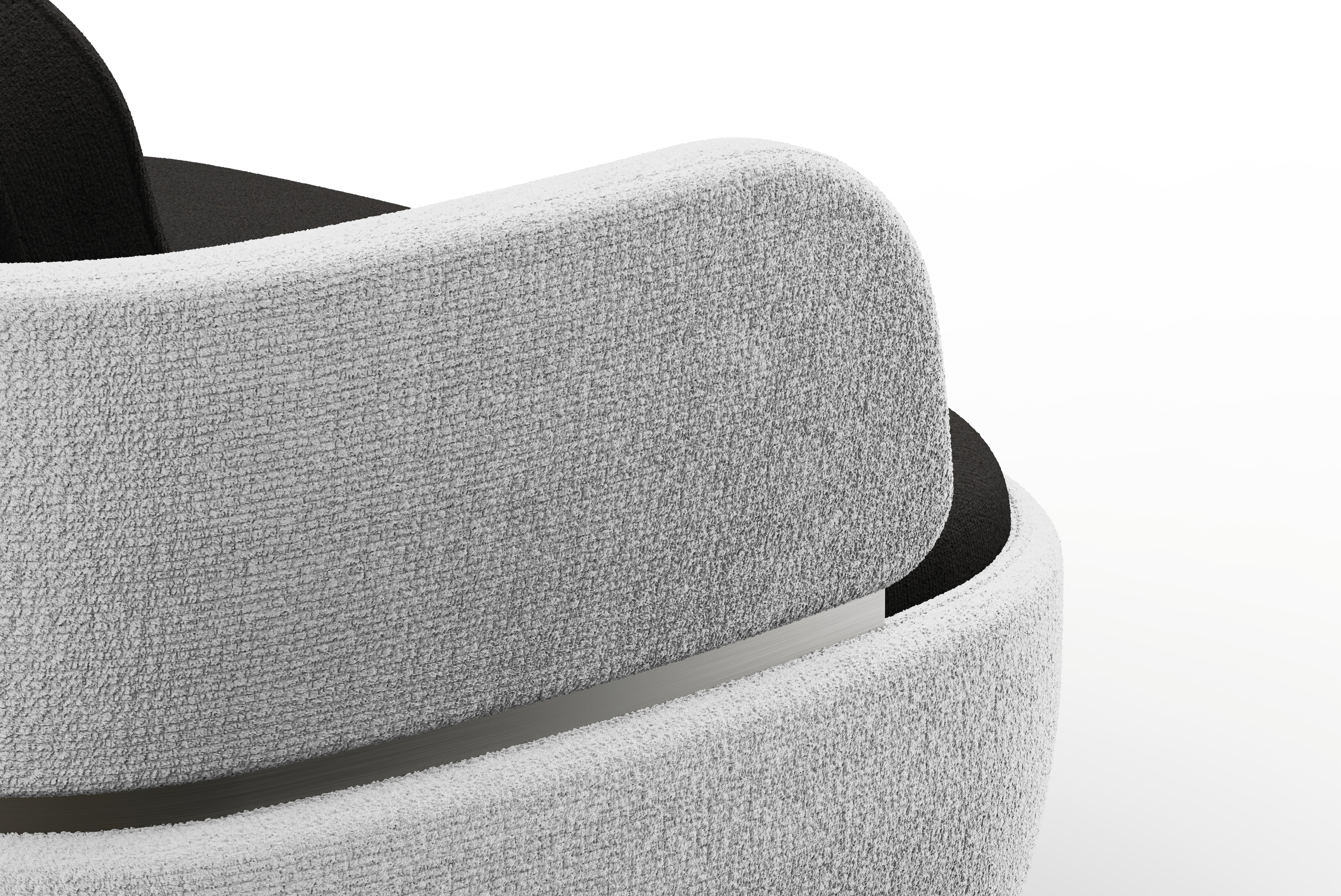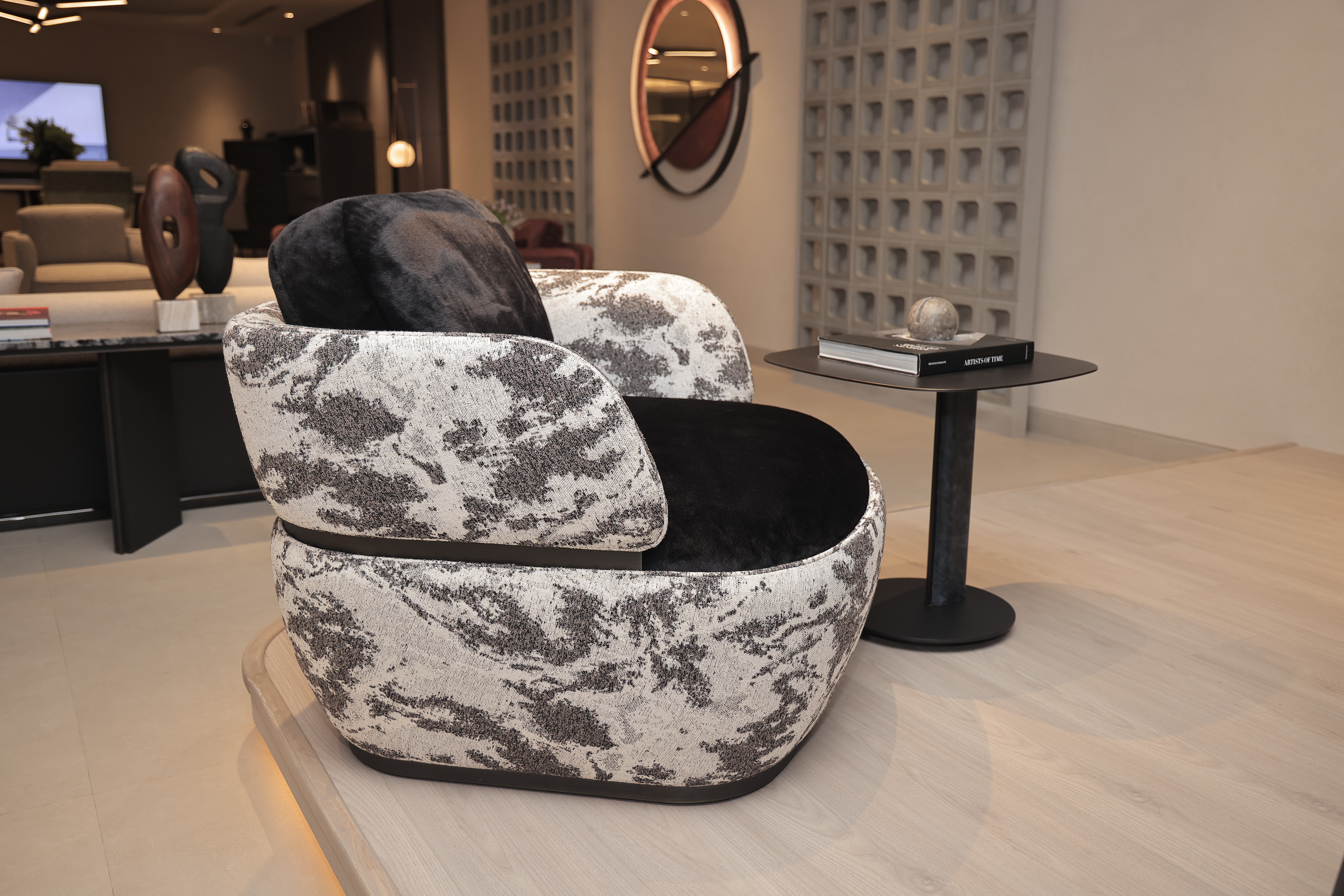 The Waka Lounge Chair blends sculptural elegance with enveloping comfort. Its generously cushioned seat rises from a rounded base, while a single upholstered element forms flared armrests and backrest, balancing definition with ergonomic ease. Accented by brushed metal detailing and dual-fabric contrasts, Waka offers visual depth and a refined sense of warmth, striking harmony between sophistication and relaxation.